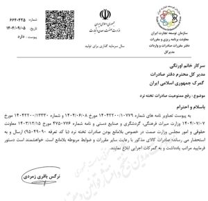سازمان توسعه تجارت با بررسی مستندات و پیشنهادها، با صدور مجوز جدید، صادرات تختهنرد را آزاد کرد. این رفع ممنوعیت توسط وزارت صنعت، معدن و تجارت به گمرکات کشور ابلاغ شده است.