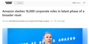 آمازون اعلام کرد که در حال حذف حدود ۱۶,۰۰۰ جایگاه شغلی در بخشهای شرکتی خود در سراسر جهان است که دومین دور از تعدیل نیروی گسترده این شرکت از ماه اکتبر محسوب میشود؛ زمانی که این شرکت ۱۴,۰۰۰ ردیف شغلی را حذف کرده بود.
