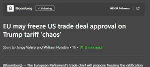 این بلوک [اتحادیه اروپا] با این توافق یکجانبه موافقت کرد، به این امید که از یک جنگ تجاری تمامعیار با واشنگتن جلوگیری کند و حمایت امنیتی ایالات متحده، بهویژه در رابطه با اوکراین را حفظ نماید. پارلمان در نظر داشت این توافقنامه را در ماه مارس به تصویب نهایی برساند.