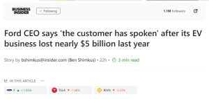 بخش خودروهای برقی فورد در سال گذشته نزدیک به ۵ میلیارد دلار ضرر کرد و جیم فارلی، مدیرعامل این شرکت، میگوید که شرکت این پیام را دریافت کرده است.