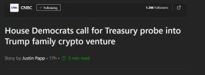 دهها تن از دموکراتهای مجلس نمایندگان روز پنجشنبه در نامهای به وزیر خزانهداری، خواستار تحقیق درباره تضاد منافع احتمالی و نگرانیهای امنیت ملی مرتبط با «ورلد لیبرتی فایننشال»، پروژه ارز دیجیتال خانواده ترامپ، شدند.