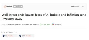 شاخص‌ هایS&P 500 و نزدک (Nasdaq) روز جمعه را با افتی بیش از ۱ درصد به پایان رساندند. سرمایه‌گذاران به دلیل نگرانی‌ها در مورد حباب هوش مصنوعی و افزایش بازده اوراق خزانه‌داری آمریکا، در حال ترک بخش فناوری و روی آوردن به بخش‌های دیگر بودند. این امر پس از آن تشدید شد که برخی از سیاست‌گذاران در برابر سیاست‌های تسهیلی پولی موضع گرفتند.